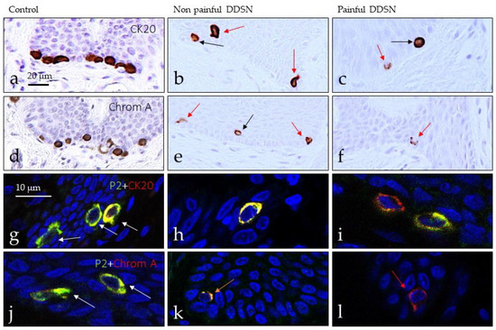 Merkel cells are epidermal cells localized in the basal stratum of the epidermis that is selectively immunolabelled with antibodies against cytokeratin 20 (CK20) or chromogranin A (ChrA). Using the expression of these proteins as a marker, Merkel cells were found in the epidermal rete pegs of all subjects investigated but the number was reduced in DDSP patients, and the number of cells decrease with neuropathic (Figure 6 and Figure 7). In the skin of control subject clusters of up to four Merkel cells were regularly observed (Figure 6a,d,g,j), whereas in NP DDSP (Figure 6b,e,h,k) and P DDSP patients (Figure 6c,f,i,l) Merkel cells were found scattered in the basal stratum of nerve-formed clusters. Nevertheless, the remaining cells retained the basic immunohistochemical profile for CK20 or ChrA.