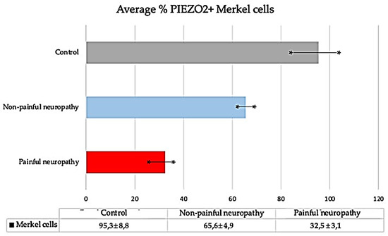 Average (expressed as mean ± DS) of PIEZO2-positive Merkel cells in the skin of control, NP DDSP and P DDSP subjects. A significant reduction in the number of Merkel’s cells was observed with disease. * is S.D.