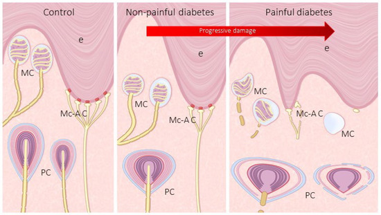 Schematic representation of cutaneous sensory corpuscles (MC: Meissner corpuscles; PC: Pacinian corpuscles) and Merkel cell–axonal complexes (Mc-Ac) in the skin of human toes from control NP DDSP and P DDSP subjects. DDSP results in a reduction in the density of all three types of mechanoreceptors, changes in their placement and morphology, as well as in their immunohistochemical profile and expression of putative mechanoproteins. E:epidermis; PC: pacinian corpuscles.