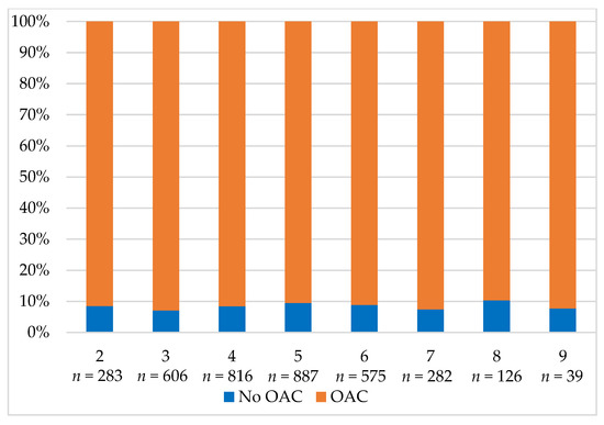 According to the guidelines of the European Society of Cardiology (ESC) as well as expert documents, it is advisable to use OACs in AF patients with a high risk of thromboembolic complications [9,10,11,12,13]. In some percent of AF patients there are contraindications to the use of OACs, and therefore it will never happen in the real world that all patients with AF who are recommended OACs will take them. In the present study, OACs were not used in 8.5% of AF patients with high thromboembolic complication risk. A comparison of our observations to the findings of other established AF registries indicates that there are principal regional differences in the prescription of OACs, and that it varies widely depending on the study period and study population. In a Korean population of high-stroke-risk AF patients, 17% were prescribed no antithrombotic therapy [14]. In the National Cardiovascular Data Registry (NCDR)’s Practice Innovation and Clinical Excellence (PINNACLE) Registry involving 674,841 AF patients of high stroke risk, authors noted that 43% of patients did not receive OACs, although the proportion of those without OAC treatment varied considerably within clinically relevant strata [15]. Among AF patients with CHA2DS2-VASc ≥ 2, 31% and 13% of patients in the Global Anticoagulant Registry in the FIELD-Atrial Fibrillation (GARFIED-AF) and Outcomes Registry for Better Informed Treatment of Atrial Fibrillation (ORBIT-AF) II, respectively, were not treated with OACs. Among these patients, there was significant geographic variability in the non-use of OACs across countries, from 69% to 7% in GARFIELD-AF; and across states within the United States, from 34% to 0% in ORBIT-AF II [16]. The differences between European, American, and global registries in the use of OACs can to some extent be connected with the differences in the researched populations. Europe’s higher OAC use could result from more frequent NOAC use. This, in turn, may be linked to an explicit class I recommendation for the application of NOACs instead of VKAs included in ESC guidelines. Temporal trends in OAC prescription were observed. In the present study including Polish AF patients with a high stroke risk hospitalized in 2018, the percentage of patients treated with OACs was very high, and in another study also involving Polish AF patients but in the years 2004–2012, the percentage of patients treated with OACs was lower, at 65% [17].