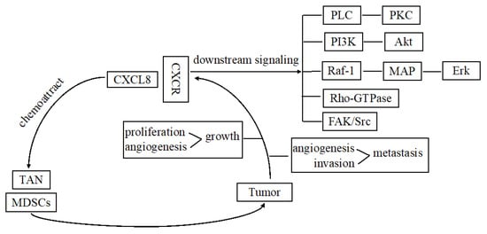 CXCL8 chemoattractant myeloid-derived suppressor cells and tumor-associated neutrophils in the tumor microenvironment are associated with immune suppression []. At the cellular level, CXCL8 binds to G-protein-coupled receptors, namely, CXCR1 or CXCR2, resulting in G-protein activation. Heterotrimeric Gα and βγ subunits stimulate the main effectors PLC and PI3K to induce phosphorylation of PKC and Akt, respectively. The two signaling pathways activate respective transcription factors associated with survival, angiogenesis, and migration of tumor cells. Additionally, CXCL8 activates nonreceptor tyrosine kinases (e.g., Src and FAK) and Rho-GTPase family members, which promote proliferation, survival, motility, and invasion of cells. The activated Raf-1/MAP/Erk signaling cascade contributes to the proliferation and survival of cells (Figure 1).