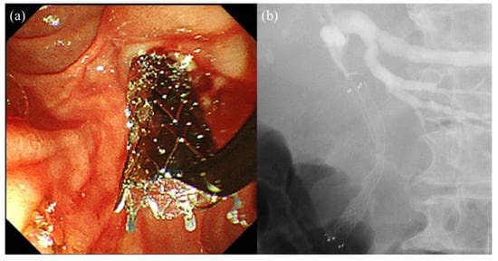 - Kitano, M.; Yamashita, Y.; Tanaka, K.; Konishi, H.; Yazumi, S.; Nakai, Y.; Nishiyama, O.; Uehara, H.; Mitoro, A.; Sanuki, T.; et al. Covered self-expandable metal stents with an anti-migration system improve patency duration without increased complications compared with uncovered stents for distal biliary obstruction caused by pancreatic carcinoma: A randomized multicenter trial. Am. J. Gastroenterol. 2013, 108, 1713–1722. [Google Scholar] [CrossRef]
