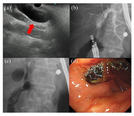 - Iwashita, T.; Yasuda, I.; Doi, S.; Uemura, S.; Mabuchi, M.; Okuno, M.; Mukai, T.; Itoi, T.; Moriwaki, H. Endoscopic ultrasound-guided antegrade treatments for biliary disorders in patients with surgically altered anatomy. Dig. Dis. Sci. 2013, 58, 2417–2422. [Google Scholar] [CrossRef] [PubMed]