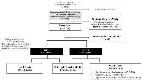 A total of 8545 people underwent a health check-up between 1 January 2017 and 30 May 2020. Among them, subjects (N = 6775) examined using both MRE and abdominal ultrasonography were included in the community-based MRE and abdominal ultrasound cohort in this study (Figure 1). Subjects who did not undergo MRE and abdominal ultrasonography at the same time or who had missing values in the biochemical tests, which are prerequisites for the assessment of metabolic syndrome except for serum basal insulin level, were excluded.