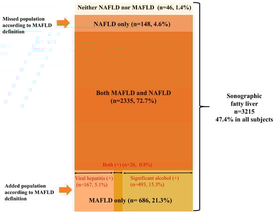 The shift of the definition from NAFLD to MAFLD has not reached a consensus, and its impact should be evaluated in real-life practice. In particular, its impact on the transition of hepatic fibrosis according to the change in the definition has not been fully assessed. Data estimating fibrosis using an appropriate method in a large cohort are still limited. To date, six cross-sectional studies have compared the fibrosis burden between NAFLD and MAFLD in community-based cohorts [,,,,,]. However, little is known about the prevalence and characteristics of populations compatible with the previous definition of NAFLD, but are now excluded from the new MAFLD definition (missed population). Additionally, there is limited information regarding those who were previously not considered to have NAFLD but have been newly included in the MAFLD definition (added population). Understanding the hepatic fibrosis burden in the added and missed populations in MAFLD is important. However, most previous studies based on the general population used predictive models for hepatic fibrosis, such as the Fibrosis-4 or NAFLD fibrosis score, rather than actual fibrosis measurements [,,]. Hence, they may have overestimated the fibrosis burden, especially in MAFLD with an alcohol-related etiology. Moreover, the number of individuals in the NAFLD-only or MAFLD-only groups was not sufficiently large to adequately compare their characteristics, even in studies that used transient elastography for the fibrosis measurement [,].