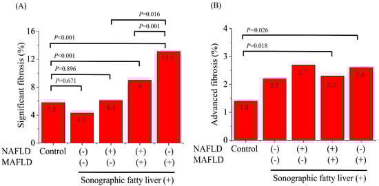 The prevalence of significant fibrosis (≥3.0 kPa) (A) and advanced fibrosis (≥3.6 kPa) (B) on magnetic resonance elastography among the healthy controls, and those with neither NAFLD nor MAFLD, NAFLD only, both NAFLD and MAFLD, and MAFLD only. Abbreviations: MAFLD, metabolic-associated fatty liver disease; NAFLD, non-alcoholic fatty liver disease.