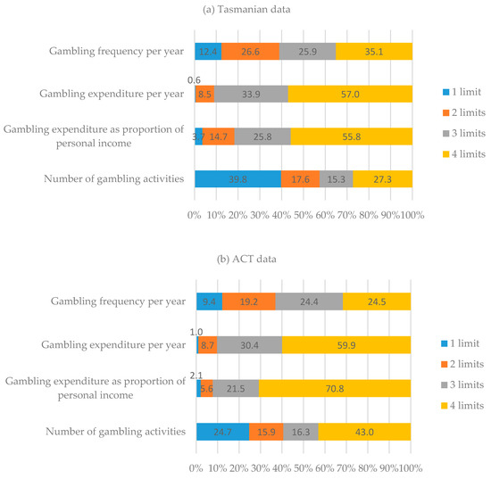 Proportion of gamblers exceeding multiple low-risk gambling limits a (a) in Tasmania; (b) in Australian Capital Territory (ACT). a Endorsement of two or more PGSI negative consequence items selected as definition for derivation of low-risk gambling limits.