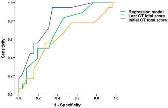 Receiver operating characteristic curve analysis for predicting tuberculous mycobacterial pulmonary disease (NTM-PD). The area under the curve of the total CT score at treatment initiation, treatment termination, and regression model were 0.618 (95% CI = 0.443–0.792), 0.713 (95% CI = 0.561–0.864), and 0.814 (95% CI = 0.689–0.939), respectively.