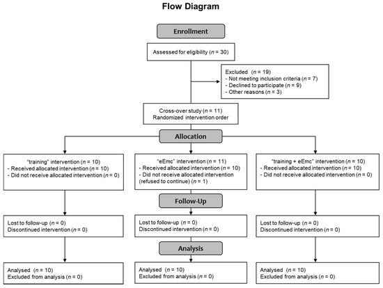 Thirty healthy subjects were selected for participating in this study (Consolidated Standards of Reporting Trials (CONSORT) flow diagram on Figure 1). Recruitment of participants consisted of self-selection within the current users of our installations as well as asking the participants for referrals. Eleven healthy volunteers accepted informed consent and completed inclusion criteria with no known history of neurological disorders and accepted to participate in the study, and ten of them (7 men, 3 women; mean age = 38 ± 11 years, age range: 24–60 years; Table 1) completed all three interventions, and were included in the data analysis (CONSORT flow diagram on Figure 1). One subject rejected to continue at the beginning of the study because of unpleasant sensation through cervical electrical stimulation. Inclusion criteria were: male or female between 18 and 65 years old without any neurological disorder and other disorder which could limit the experiment (uncontrolled cancer, arthritis, etc.), and had written informed consent. Exclusion criteria were any metal implants, implanted electrical devices, medications that could raise seizure threshold, cardiac conditions, and history of syncope or concussion with loss of consciousness, tinnitus, or pregnancy. The study protocol was approved by the Research Ethics Committee of the Institute Guttmann and was conducted in accordance with the Declaration of Helsinki [21].