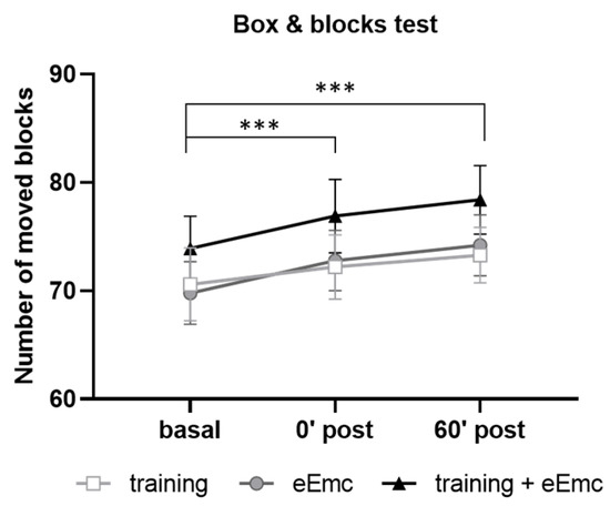 Number of moved blocks in the box and blocks test (BBT) for hand training, eEmc, or combination of both interventions right after intervention (0′ post) and during follow-up (60′ post) in comparison to basal evaluation. Significant differences between timepoints according to Tukey’s multiple comparisons (considering all intervention groups as a whole): *** p < 0.001.