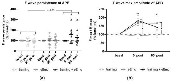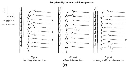 F wave was used to detect excitability of anterior horn motoneurons in the spinal cord. There was a significant effect of intervention over F wave persistence (Friedman’s test = 5.84, df 3.30, p = 0.05) (Figure 4a). Dunn’s post-hoc comparisons revealed an overall increase in F persistence after eEmc combined with training compared to training alone that almost reached statistical significance (p = 0.053). The intervention factor had a nearly significant impact on F wave amplitude (F(2, 18) = 3.10, p = 0.07). Post hoc comparisons showed that eEmc delivery, with or without hand training, increased F wave amplitude when compared to training alone (p < 0.05), particularly at 0′ post intervention (Figure 4b,c).