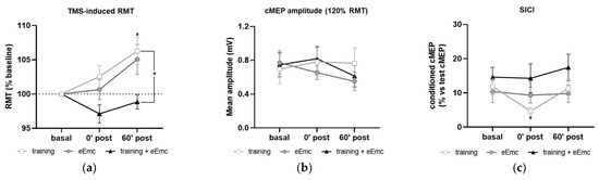 The RMT in APB at basal conditions was 37.9 ± 1.2% of maximum TMS intensity. RMT was significantly affected by timepoint in the training intervention (Friedman’s test = 7.93, df 3.10, p < 0.05) and by intervention at 60′ post (Friedman’s test = 8.06, df 3.10, p < 0.05) (Figure 5a). Dunn’s post-hoc comparisons confirmed that higher RMT was found 60′ after training (p < 0.05). eEmc with training significantly reduced RMT when compared to training alone at this timepoint (p < 0.05). Corticospinal excitability measured by cMEP amplitude obtained at 120% RMT stimulus did not differ between interventions (F(2, 18) = 0.25, p = 0.77) or between timepoints (F(2, 18) = 1.55, p = 0.23) (Figure 5b).