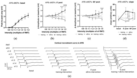 Effect of interventions on cortical recruitment curve. (a) Pooled APB recruitment curves obtained at baseline for each subject and intervention. (b,c) Increase or decrease (in millivolt (mV); indicated as Δ) in APB recruitment curves with respect to baseline at 0′ (b) and 60′ (c) post intervention. ★ p < 0.05, ★★ p < 0.01, ★★★ p < 0.001 training vs. training + eEmc; ✰ p < 0.05, ✰✰✰ p < 0.001 eEmc vs. training + eEmc. (d) Slope of APB cMEP recruitment curves. Indicated slopes correspond to the slope of the linear regression line through stimulation intensities (in %RMT) and cMEP values (in mV), multiplied ×1000 to facilitate data visualization. ★ p < 0.05, ★★ p < 0.01, between interventions at 0′ post and 60′ post. (e) Representative APB muscle recording (obtained from subject #1) corresponding to recruitment curve assessment at basal (three conditions averaged) and 0′ post each intervention. APB, abductor pollicis brevis; RMT, resting motor threshold; cMEPs, cortically-induced motor evoked potentials.