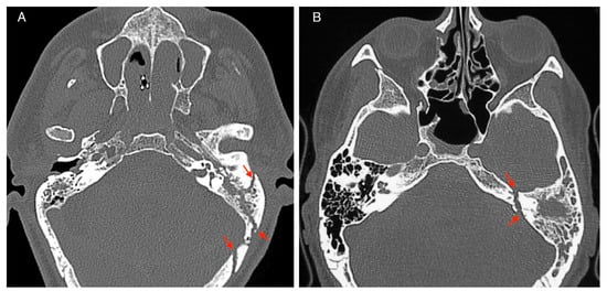 Temporal bone fractures (TBFs) represent 14–22% of cranial fractures [1,2,3,4,5,6,7,8]. In the majority of patients, these fractures are unilateral, but approximately 12% of TBFs are bilateral [8,9]. TBFs have been extensively studied because of their severity and emergent nature [1,8,10]. Conventionally, TBFs are divided into transverse, longitudinal, and mixed, depending on the direction of the fracture line compared to the long axis of the petrous pyramid [1,8,9,10,11]. Some authors have criticized this classification because many fractures do not strictly follow this scheme [8,9,10,11,12,13]. An alternative classification system grouped TBFs as those sparing the otic capsule (OSC) or violating the otic capsule (OVC), because its involvement is a source of severe complications, which negatively affect patient quality of life (QoL) [1,8,9,10,12,13,14]. Approximately 95% of all TBFs are OSC fractures [1,10,12]. The diagnosis and management of TBFs must be made in a short time, as they deeply influence the prognosis. The close collaboration between anesthetists, neurosurgeons, radiologists, and otolaryngologists is of fundamental importance [1,8].