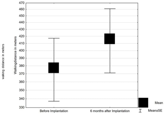 Six-minute walk distance improved significantly from 369.5 ± 163.5 m at baseline to 410 ± 169.7 m at the 6-month follow-up under continuous PNS treatment (p = 0.035) (Table 3, Figure 1).