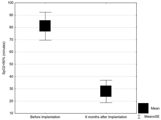 Central respiratory events, both apneas and hypopneas, were well controlled by PNS. The number of total central apnea events decreased significantly from 109.5 ± 102.5 at baseline to 38.6 ± 53.5 six months after PNS implantation (p = 0.027) (Table 3). Initial Apnea-hypopnea index (AHI) was 38.1 ± 17.9/h and through phrenic nerve stimulation AHI showed 17.3 ± 9.4/h. Hypoxemic burden, determined based on the time with oxygen saturation <90% (T < 90) on PSG was 81 ± 55.7 min at baseline, and decreased to 27.8 ± 42.7 min during follow-up on PNS (p < 0.01) (Table 3, Figure 2).