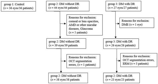 Flow diagram illustrating the study selection process. n, number; DM, diabetus mellitus; DR, diabetic retinopathy; AMD, age-related macular degeneration; OCT, optical coherence tomography; DME, diabetic macular edema; ERM, epiretinal membrane.