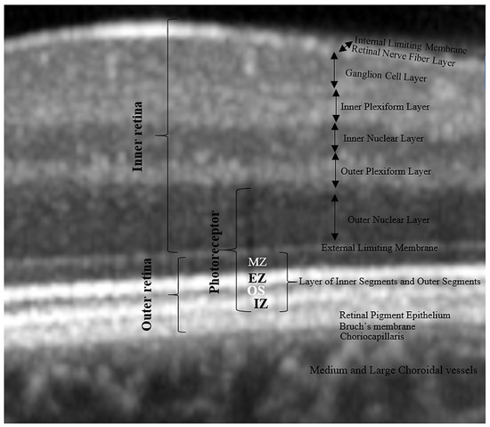 Retinal layer segmentation. MZ, myoid zone; EZ, ellipsoid zone; OS, outer segment; IZ, interdigitation zone.
