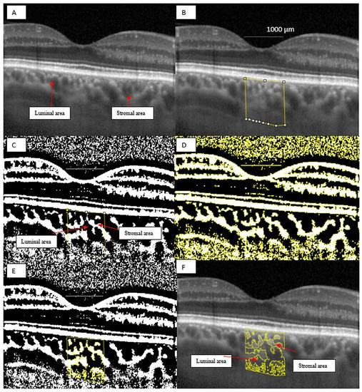 - Sonoda, S.; Sakamoto, T.; Yamashita, T.; Uchino, E.; Kawano, H.; Yoshihara, N.; Terasaki, H.; Shirasawa, M.; Tomita, M.; Ishibashi, T. Luminal and Stromal Areas of Choroid Determined by Binarization Method of Optical Coherence Tomographic Images. Am. J. Ophthalmol. 2015, 159, 1123–1131. [Google Scholar] [CrossRef] [PubMed]
