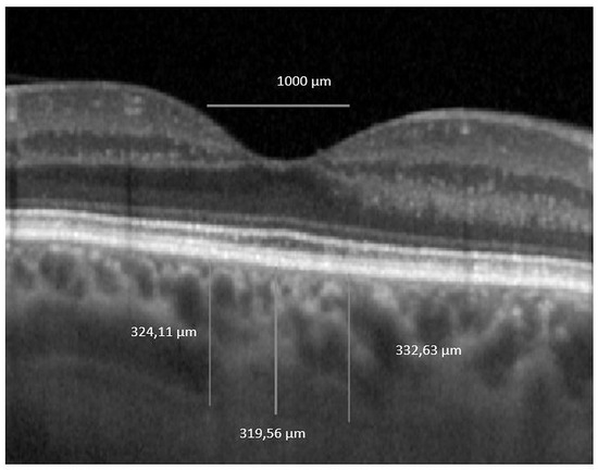 The horizontal macular EDI-OCT 1x1 μm scan was uploaded in ImageJ, public domain software (version 1.53a, https://imagej.nih.gov/ij/) [26]. We first set the image scale and then we drew a horizontal 1000 μm line which served as a marker for our measurements. ChT was defined as the distance between the outer boundary of the RPE/Bruch’s membrane and the choroidal–scleral interface. Central subfoveal ChT was defined as the ChT value in the central circle of the standard ETDRS grid, which represents 1000 μm. The nasal and the temporal ChT were manually measured as 500 μm nasally and temporally to the central subfoveal point. Then we averaged the 3 values to obtain the foveal ChT (FChT), a single value that we further used in the analysis (see Figure 4).