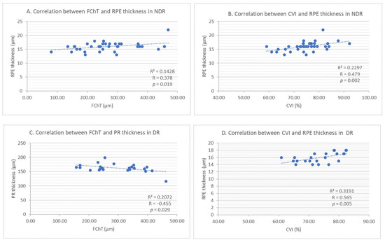 In the NDR group, RPE thickness seems to be moderately positively correlated with CVI (R = 0.479 and p = 0.002) (see Figure 7B) and with FChT (R = 0.378 and p = 0.019) (see Figure 7A). In the DR group, RPE is positively strongly correlated only with CVI (R = 0.565, p = 0.005) (see Figure 7D). ONL thickness was moderately negatively correlated with FChT in the DR group (R = −0.447 and p = 0.032). The PR layer was moderately negatively correlated with FChT in the DR group (R = −0.,455 and p = 0.029) (see Figure 7C).