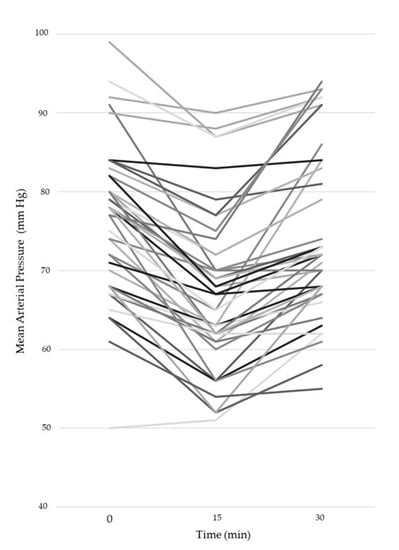 The mean heart rate at T1 was 83 bpm (SD 9.24) and at T2 was 81 bpm (SD 7.18). The mean MAP at T1 was 76.15 (SD 3.04) mmHg, after 15 min it was 67.6 (SD 3.01) mmHg and at T2 it was 74.5 (SD 3.34) mmHg; variations in MAP are depicted in Figure 1.