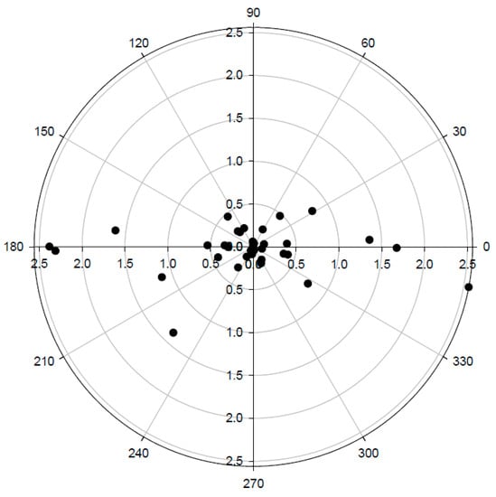 The trending ability of MostCare of overall patients is shown by data points dispersion on polar plot analysis (Figure 3): 29 data points (difference in CO between T1 and T2), were inside 10% of CO variation, indicating a substantial correspondence between the two values. Among the remaining 11 data points, the polar concordance was 82% (data between 30° angles).