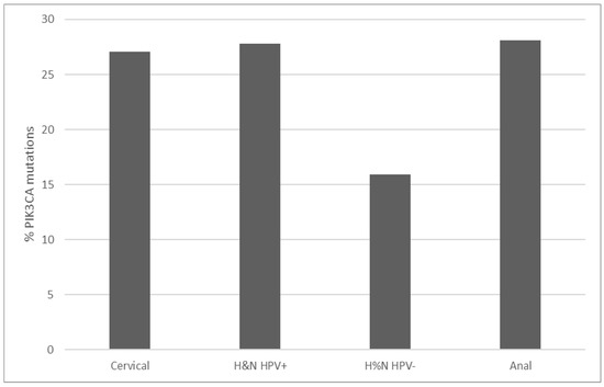 Prevalence of PIK3CA mutations in cervical carcinomas, HPV+ and HPV– head and neck carcinomas and anal carcinomas. Fisher’s exact test p = 0.01 for the comparison of PIK3CA mutations in HPV+ and HPV– head and neck carcinomas. Data are from TCGA and MSK-IMPACT.
