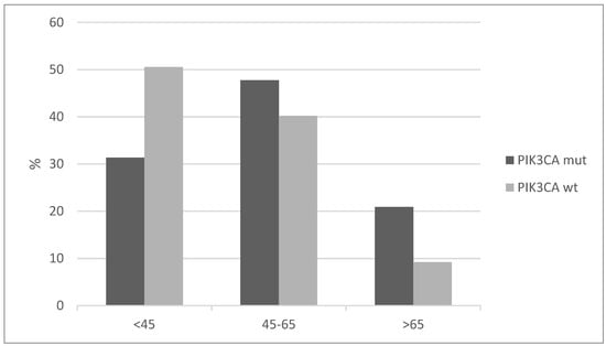 Patients with cervical squamous carcinomas and PIK3CA mutations tend to present in a more advanced age than the cervical cancer patients without PIK3CA mutations. More than 20% of cases in the group with PIK3CA mutations were older than 65, while the percentage of older than 65 years-old patients in the group without PIK3CA mutations was less than 10% (Figure 2). Conversely, half of the patients without PIK3CA mutations present at age 45 and younger.