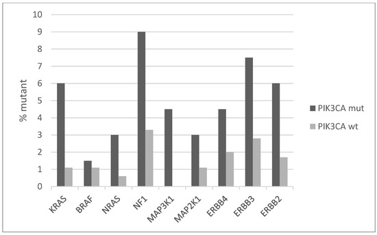 Percentage of mutations of genes of the receptor tyrosine kinase-RAS-RAF-MEK cascade in PIK3CA mutant and wild-type cervical cancers. Fisher’s exact test p = 0.002 for the comparison of cases with mutations in any of these genes versus cases with none of these genes mutated in the two groups (PIK3CA mutant and PIK3CA wild-type). Data are from TCGA.