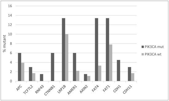 Percentage of mutations of genes of the Wnt/β catenin pathway in PIK3CA mutant and wild-type cervical cancers. Fisher’s exact test p = 0.03 for the comparison of cases with mutations in any of these genes versus cases with none of these genes mutated in the two groups (PIK3CA mutant and PIK3CA wild-type). Data are from TCGA.