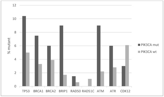 Percentage of mutations of genes involved in DNA damage response and repair pathways in PIK3CA mutant and wild-type cervical cancers. Fisher’s exact test p = 0.15 for the comparison of cases with mutations in any of these genes versus cases with none of these genes mutated in the two groups (PIK3CA mutant and PIK3CA wild-type). Data are from TCGA.