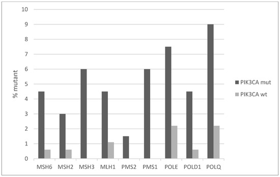 Percentage of mutations of mismatch repair (MMR) genes and genes encoding for the proof-reading polymerases epsilon and delta (POLE and POLD1) in PIK3CA mutant and wild-type cervical cancers. Fisher’s exact test p = 0.0004 for the comparison of cases with mutations in any of these genes versus cases with none of these genes mutated in the two groups (PIK3CA mutant and PIK3CA wild-type). Data are from TCGA.
