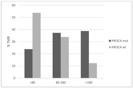 Mutations of genes involved in mismatch repair (MMR) and producing microsatellite instability (MSI) are overall rare in cervical cancers with an individual frequency of 2% or less. However, the PIK3CA mutated group displays higher frequencies ranging from 3% to 6% (Figure 7). Similarly, the genes for proofreading polymerases POLE and POLD1 are mutated in 7.5% and 4.5% of PIK3CA mutated cancers versus 2.2% and 0.6% of PIK3CA non-mutated cancers. Consistent with the higher mutation frequency of MMR and proofreading polymerases mutations and the known association of MSI with high total mutation burden (TMB), PIK3CA mutated cervical cancers display a higher TMB than PIK3CA wild-type counterparts (Figure 8). Importantly, almost 40% of PIK3CA mutated cervical cancers have a TMB of above 180. This percentage is only 12.3% in unmutated cancers.