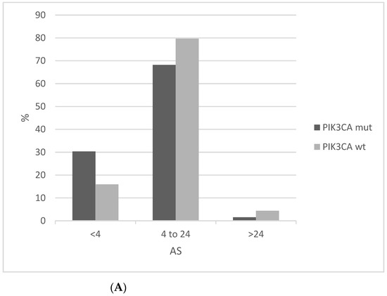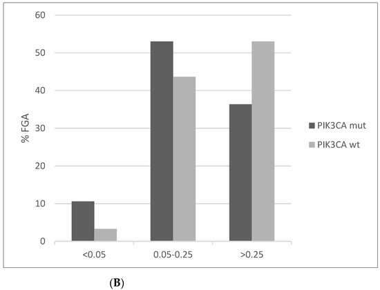 In contrast to MSI, chromosomal instability as measured by AS is lower in PIK3CA mutated cervical cancers compared to PIK3CA wild-type counterparts (Figure 9A). AS below 4 is observed in 30.3% mutated cancers compared to 15.9% of PIK3CA wild-type squamous cervical carcinomas. In addition, the PIK3CA mutated group presents a higher percentage of low Fraction of Genome Altered (FGA, another measure of chromosomal instability) cases than the PIK3CA wild-type group (Figure 9B).