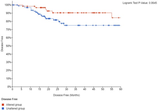Survival analysis of TCGA cohort disclosed that neither mutations nor amplifications of PIK3CA are prognostic for disease free survival (DFS) or overall survival (OS) (not shown). However, when lesions of PIK3CA were combined a trend towards a better DFS in the group with PIK3CA alterations that did not reach statistical significance (p = 0.06) was observed (Figure 10). OS remained not different between groups. These results suggest that despite the key role of PI3K kinase in oncogenesis, it is not prognostic for outcomes in squamous cervical carcinoma. However, the fact that DFS was worse, albeit not reaching statistical significance, in cancers with PI3K lesions is intriguing and suggests that PI3K dysfunction may have prognostic implications in these cancers. This could be confirmed with a more extensive study size.