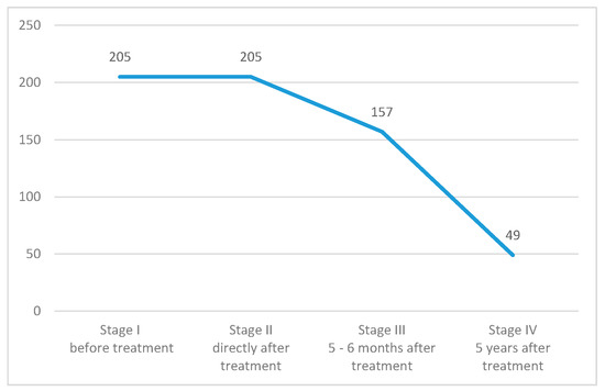 Despite those difficulties, we managed to conduct the project in five major Polish cancer centers. In total, 205 women were qualified and took part in the first two stages. Of which, 157 respondents took part in the third stage, which took place 5–6 months after treatment. Only 49 participants lasted until the fourth stage which was 5 years after treatment. Subjects that participated in all stages of the study were the basis for statistical analysis. A limitation of this study was the lack of a possibility to determine the cause of dropout, whether it was death or a decision to quit.