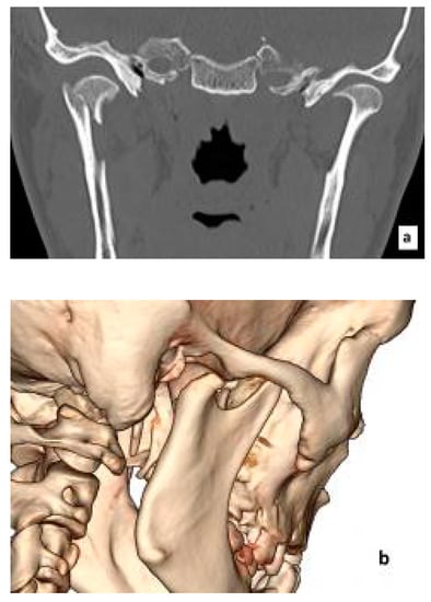 Fracture of the right mandibular head. Computed tomography: frontal scan (a) and 3D reconstruction (b).