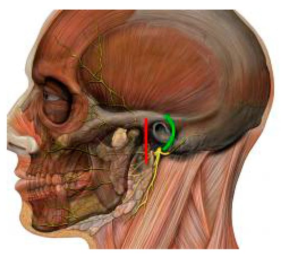 The course of the facial nerve branches in relation to the mandibular head. Retro-auricular (green line) and pre-auricular (red line) approaches. Modified from Patrick J. Lynch and C. Carl Jaffe: Head human skull lateral view, Head facial nerve superficial branches. 2006. https://creativecommons.org/licenses/by/2.5/.