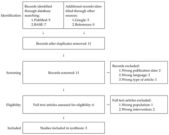 A total of 21 items were identified of which 11 remained after eliminating duplicates. Out of 11 papers, eight were rejected during the screening and full-text reading stages, which did not meet the above-mentioned PICOS criteria. All authors of this review agreed independently on the decision to reject articles at the previously mentioned stages. The individual stages of the PRISMA protocol implementation are presented schematically in Figure 3. Details on the reasons for rejection of eight out of 11 articles are included in Table S2.
