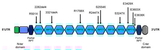 Genomic DNA was extracted from peripheral blood samples using the QIAamp DNA Mini kit (Qiagen, Hilden, Germany). The loci of interest of the FLG gene were selected on the basis of the allelic frequency of the loss-of-function mutation reported on the ExAc database [] and from literature. The analyzed loci were: R501X and 2282del4 (in the first repeat, RPT1), 3321delA (RPT2), R1798X (RPT5), S2554X and R2447X (RPT7), S3247X (RPT9), E3429X, E3603X and R3638X (RPT10) (Figure 1). Target regions were amplified by PCR by means of the AmpliTaq Gold (Thermo Fisher, Waltham, MA, USA). Primers were designed with the Primer Express software v 3.0 (Thermo Fisher, Waltham, MA, USA) in the regions with the highest number of mismatches among the different RPTs of the third exon of the gene and the specificity was verified using Primer Blast []. The amplified FLG fragments were sequenced by Sanger sequencing procedure with the BigDye Terminator v1.1 Cycle Sequencing kit (Thermo Fisher, Waltham, MA, USA) and loaded on the ABI 3730 DNA Analyzer (Thermo Fisher, Waltham, MA, USA). Primer sequences are available in Supplementary Table S1.