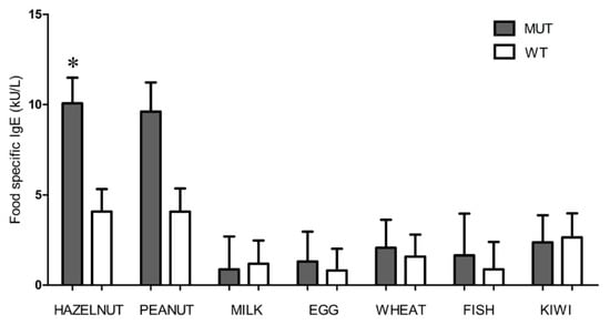 Food specific IgE levels in the FLG mutated (grey) and wild-type (white) groups. Geometric IgE mean values with standard error are reported. Hazelnut (*, p-value = 0.03) is the only variable with a statistically significant difference between the FLG mutated and wild-type groups according to the multivariate model.