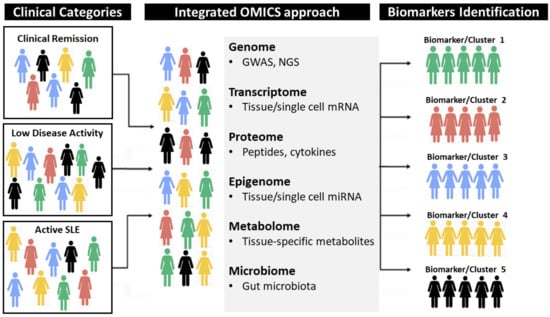 A hypothetical example illustrating how an integrated clinical and OMICS approach, driven by artificial intelligence, might help distinguishing homogeneous clusters from current heterogeneous phenotypes observed in Systemic Lupus Erythematosus (SLE). The example suggests that the way to identify new clusters with specific disease biomarkers should be tailored to the specific molecular events or pathways associated with disease activity and clinical phenotypes, providing a rationale for personalized therapeutic interventions.