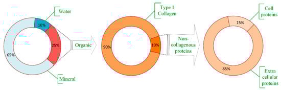 Bones are living organs constantly modeling and remodeling throughout life and serve as reservoir for calcium, phosphate and many other bodily elements, thereby, assuring their homeostasis [9]. Bone consists of an organic matrix, mineral components, and water, as presented in Figure 1. The bulk part of the organic matrix consists of type I collagen, but other non-collagenous proteins are also present, mainly extracellular and a small part within the cells [10]. Bone composition, by weight, is approximately 65% mineral (mostly as hydroxyapatite (85%), but also calcium carbonate and calcium fluoride [9]), organic part is approximately 20% to 25%, mostly type I collagen (about 90%) [10], while the water content varies between 10% and 20% depending on several factors including age, species, bone health, etc. [11].