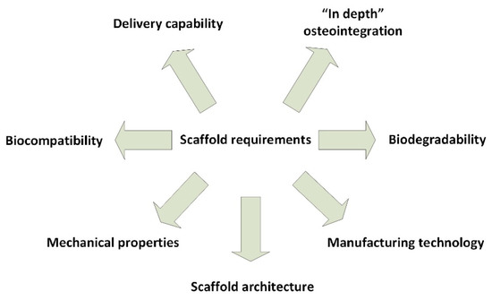 Scaffold material aims to support the viability of the adequate cell category and simultaneously operate as a nonpermanent replacement of the bone extracellular matrix, as a substitute matrix that will preferably be displaced by newly functional bone tissue [31], while reproducing the properties of normal bone tissue formation [9]. Scaffolds designed to aid regeneration need to encourage migration, cell adhesion, proliferation, and differentiation [8] and ideally some essential features and functions should be certainly considered: architecture, cytocompatibility, bioactivity, biodegradability, and mechanical characteristics [9].