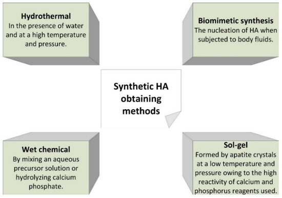 Synthetic HA can be obtained by different methods, as seen in Figure 4. Parameters such as temperature, pH, reaction time, and concentration of reagents during synthesis can affect the properties of the obtained HA [4].