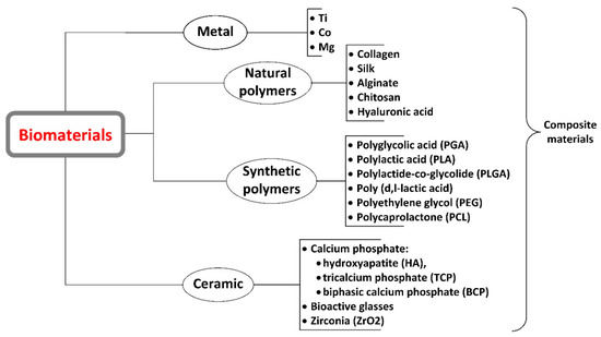 Long-term exposure to PLGA acidic by-products upon degradation may cause tissue necrosis and implant failure. An array of polyphosphazenes has been incorporated in PLGA scaffolds, in order to control degradation rates and create more efficient scaffolds. Polyphosphazenes have nontoxic and neutral pH or basic products upon degradation and can be fine-tuned according to the degradation rates aimed [9]. pH is an important factor to take in account as the calcium phosphate precipitates start appearing with a rise in the pH and the sequential cross linkage of collagen chains depends on pH for bone regeneration [35]. The majority of polymer materials do not have osteoconductive properties and can lead to stress relaxation behavior and creep [16]. Figure 5 present some of the most important biomaterials used in bone tissue engineering: metals and alloys, polymers, and ceramics, but also derived composite materials.