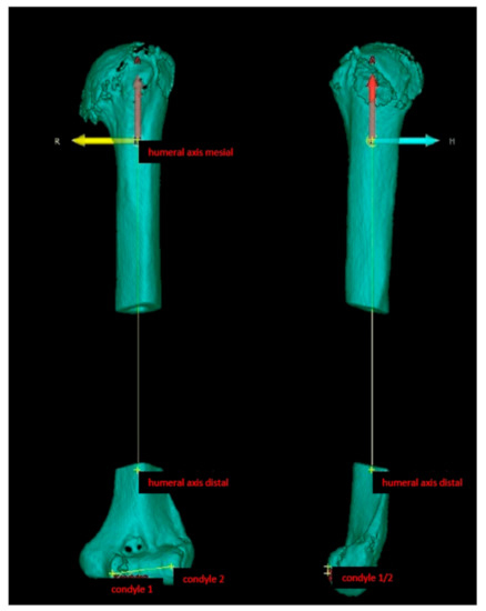 For calculation of the morphologic parameters, a technique established in orodental research and also already used for evaluation of reproducibility of anatomical landmarks and the accuracy of different types of computer tomography was used [15]. In particular, the humerus scans were set in a coordinate system, which was virtually overlayed over the scans for software-based assessment. All required calculation points were defined by IVS Technology GmbH and independently double-checked and verified by one project collaborator (SH) and the senior author. First, the center of the condyle–humeral axis and the distal and proximal humeral center were set as virtual references for a humeral coordinate system (Figure 1).