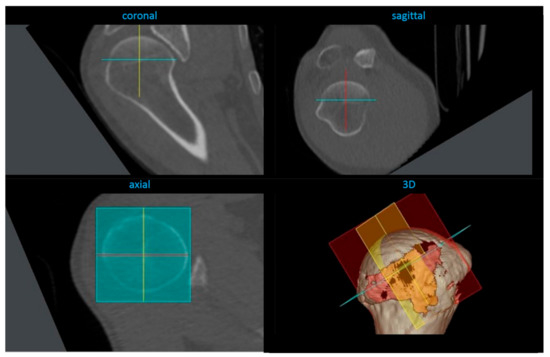 The distance from the humeral head center and condyle–humeral-axis center served as a scale for calculations of the geometrical parameters. These were calculated within the three-dimensional humeral head coordinate system in the sagittal, axial, and coronal planes, respectively (Figure 4).