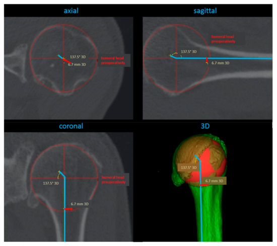 Shoulder arthroplasty was initially introduced in the 1950s by Charles Neer for the treatment of proximal humerus fractures [1,2]. Since then, the indication for shoulder arthroplasty was widened for shoulder osteoarthritis and many techniques and designs were developed to anatomically reconstruct the joint morphology and to achieve almost normal joint function. During this process, many stem-related complications including intraoperative humeral fracture, loosening, stress shielding, or periprosthetic humeral fracture were described [3]. Consequently, stem designs were revised regarding bony anchoring techniques and gradually shortening of the humeral stem implants. In 2004, the first stemless shoulder arthroplasty implant was introduced by Biomet in Europe [2,4] and, since then, many other stemless shoulder endoprostheses were developed [5]. The advantages of this type of prosthesis are obvious: the elimination of the humeral stem and the isolated metaphyseal fixation allow for a more flexible reconstruction of the anatomical morphology in degeneratively changed and deformed shoulder joints. Furthermore, the risk of periprosthetic fractures is significantly reduced. It also offers many additional opportunities in revision surgery due to the preserved bone stock [1,2,3,4]. According to the current literature, many studies describe a promising clinical outcome and radiologic results on X-ray analysis [1,6,7,8]. However, just a few studies investigate the shoulder joint geometry after stemless shoulder arthroplasty. All of the available studies evaluate joint morphology based on two dimensional X-ray analysis and the comparison of the preoperative and postoperative joint status [9,10,11,12]. The current literature lacks any data concerning three-dimensional computer-tomography-based joint geometry analysis after stemless shoulder arthroplasty.